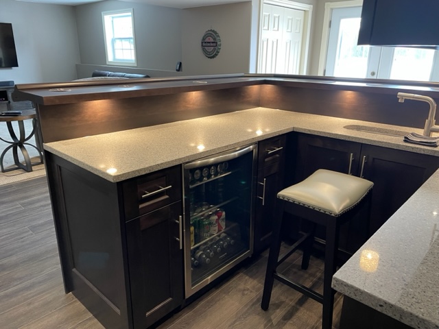 Bring the pub-vibe home with Palmer’s Woodworking! Their skilled craftspeople transformed a basement in Belwood, ON into an inviting and lively bar space for their client to enjoy.
